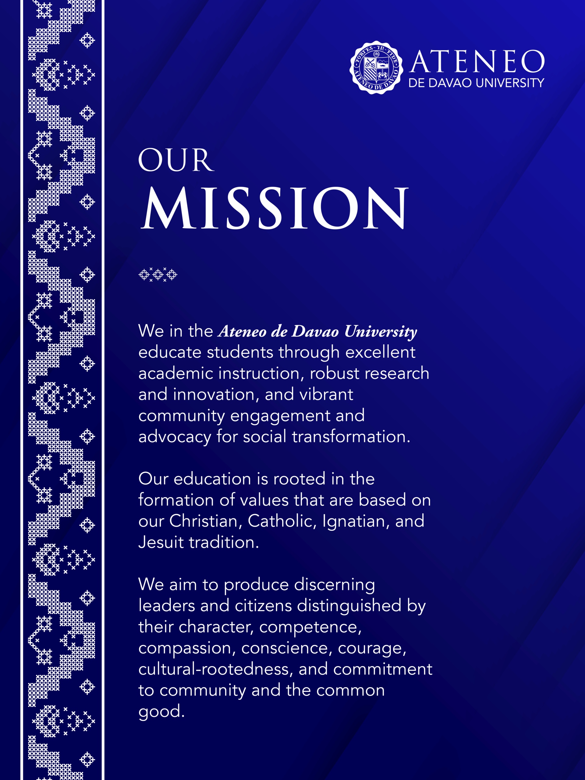 We in the Ateneo de Davao University educate students through excellent academic instruction, robust research and innovation, and vibrant community engagement and advocacy for social transformation.